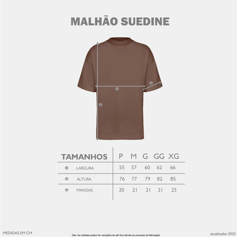 Camiseta Suedine Oversized - Produzida em 100% algodão, com modelagem oversized exclusiva no estilo streetwear. Malha suedine com gramatura de 230 g/m²: mais encorpada, resistente e com toque macio, mantendo a forma mesmo após várias lavagens. Gola canelada 2x1 de 3,5 cm, com acabamento reforçado.